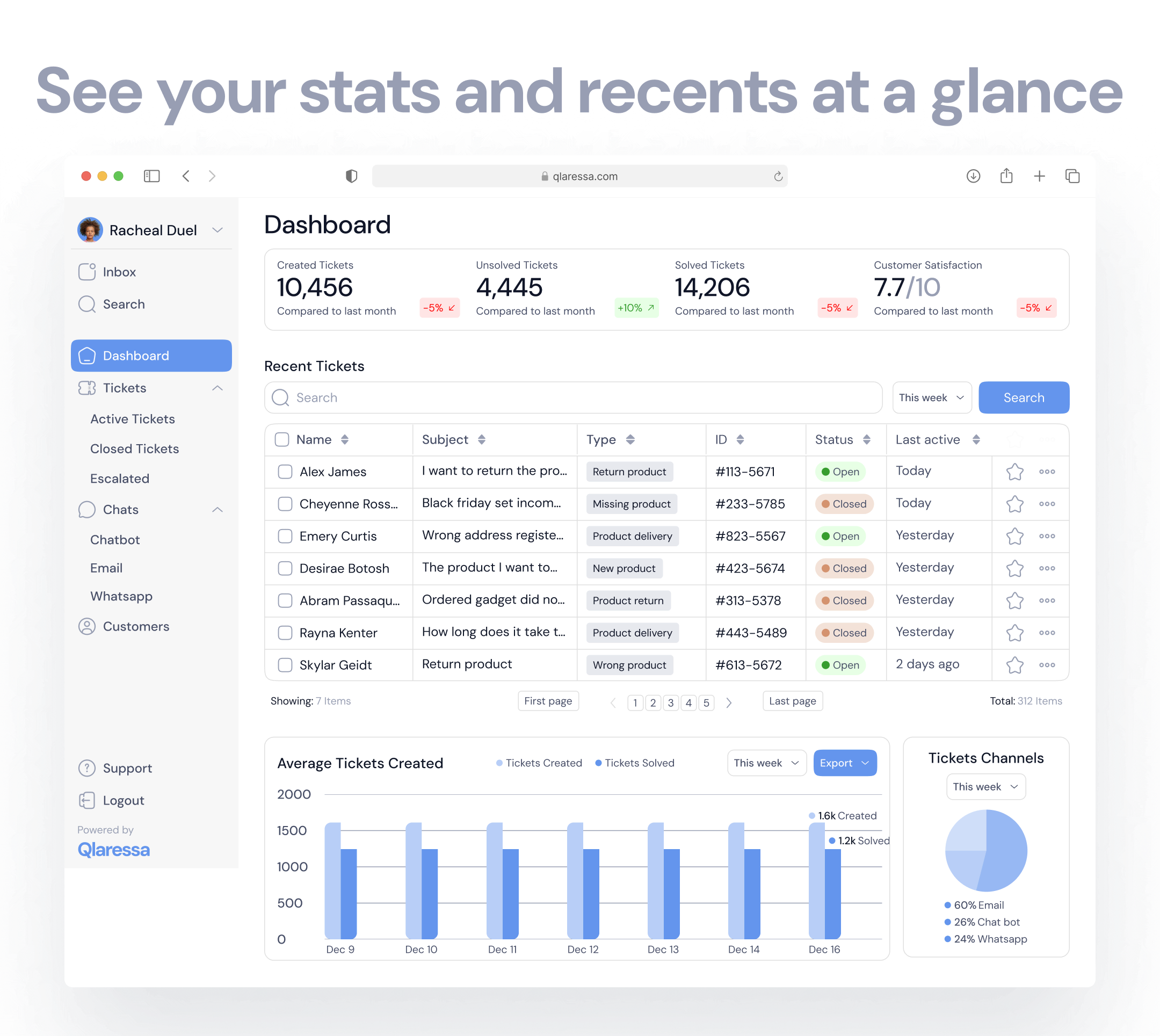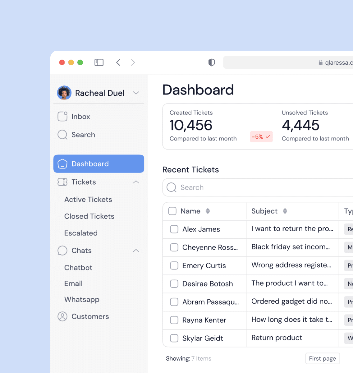 The Qlaressa web app is fully responsive and optimized for mobile use, ensuring that customer service agents can manage tickets and communication efficiently across all device types. ⬇️